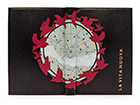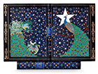Louise Brockman marbled endleaves; gilt edges (solid on all three edges); sewn on four 6mm linen tapes; spine glued and shaped; laminated cushioned boards laced on; multicoloured double endbands; spine lined with unbleached cotton and acid free paper hollow; book covered in full black goatskin; design applied with goatskin onlays, gold and palladium tooling; lettered in gold leaf; book housed in velvet lined quarter leather box lettered in gold to spine.