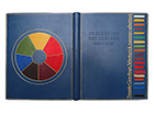 THE VELLUM BOOK, Honourable Artillery Company 2014 (Signature book)bound by James & Stuart Brockman Vellum leaves; marbled paper in HAC colours made by Louise Brockman; book covered in full dark brown Harmatan goatskin; Hallmarked silver clasps, corners and centre pieces (supplied and engraved by silversmith Paul Barnard); turn-ins blind tooled with red and blue Harmatan leather onlaid into the lines; spine blind tooled; boards blind tooled and black goatskin onlaid into tooled lines. Quarter Harmatan leather box, lettered in palladium and tooled with the HAC crest, lined with museum grade Ultra IV fabric.